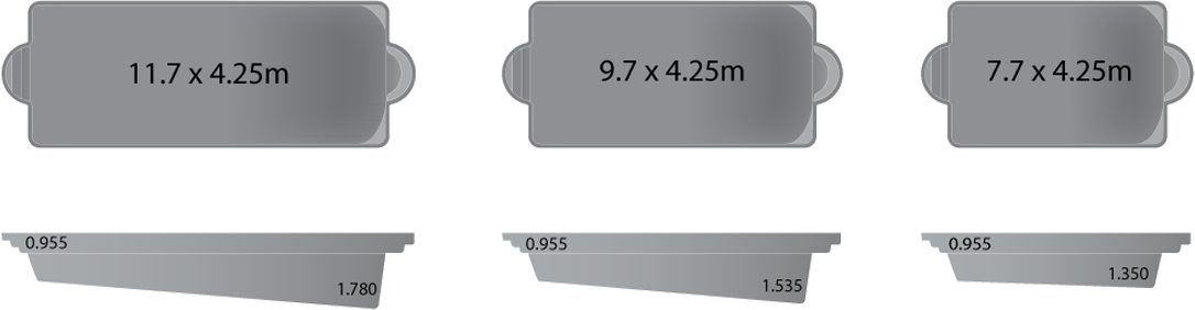 The Caesar swimming pool boasts an elegant yet functional design with entry steps at the shallow end and a generous seating area at the deep end. Each side of the pool features a safety foot ledge.